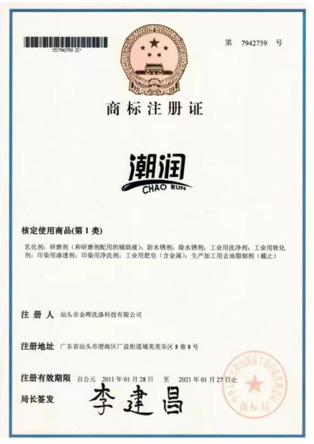 潮潤商標(biāo)注冊(cè)證